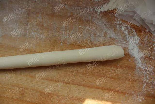 4,取出按压排气,撒点面粉搓成光滑的细长条。