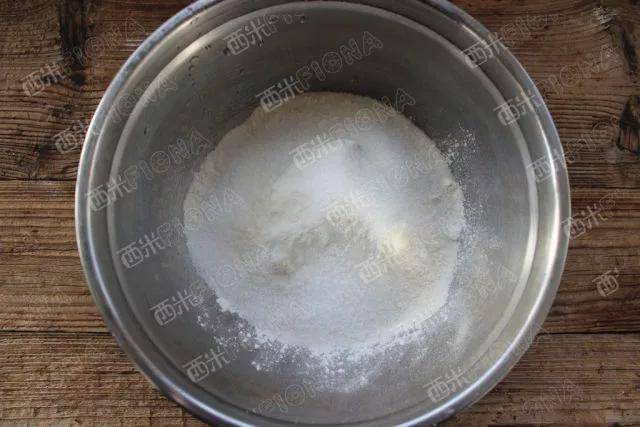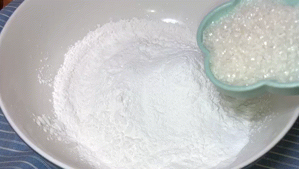 1,碗里放入糯米粉150克,泡打粉8克,白糖15克。