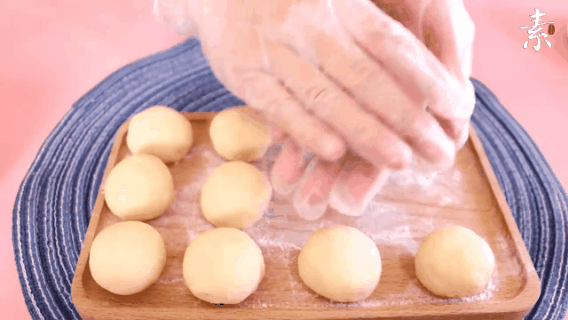 3,分成小剂子,揉成圆球,压成小饼,封上保鲜膜,醒发膨胀。