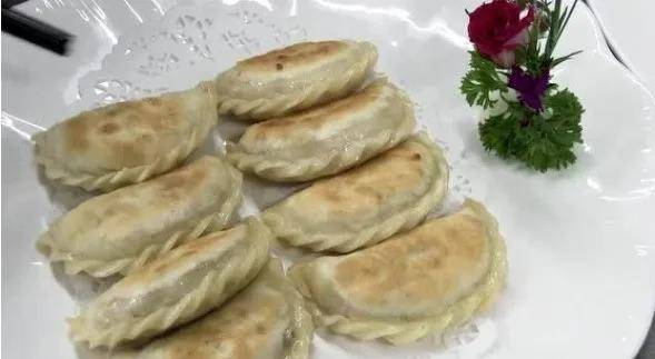 4、在煎锅下少量油,预热,把捏好的饺子放进去,下点水盖上盖子,待两面煎出金黄锅巴,起锅摆盘即可。