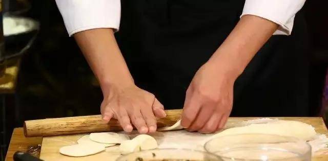 2、把面团压薄,用圆形模具印出圆形面皮。