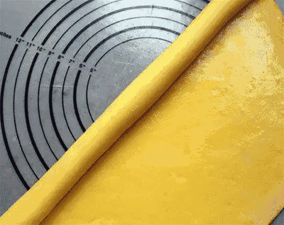 3. 水皮面团包住油心面团,擀成长方形,往中间折叠三层,再擀成长方形,再对折擀薄,用刀切成长条状,再叠起来成酥皮,放入冰箱冻硬。