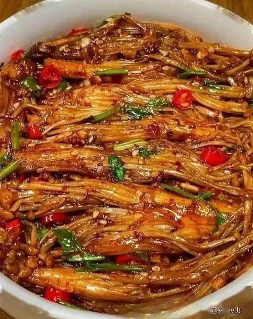 做法:调酱汁,锅中刷油煎金针菇至焦黄,淋酱汁。