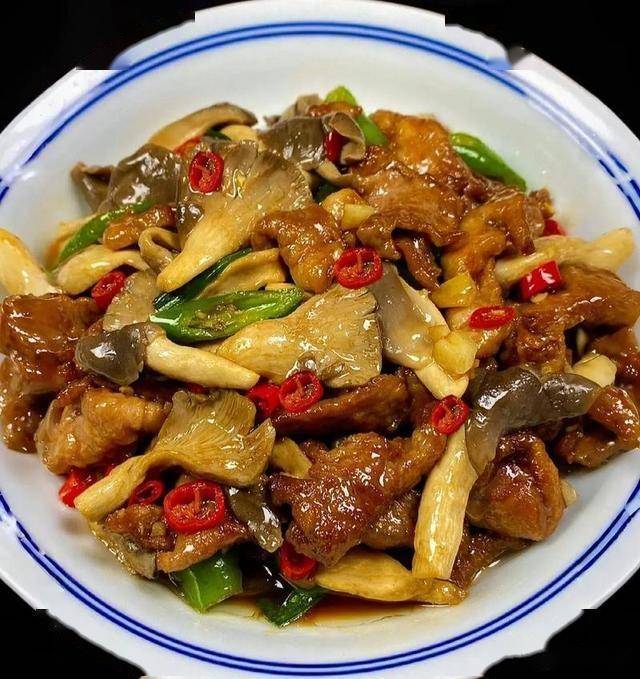 做法:蘑菇切片,猪肉切片腌制;爆香蒜末,炒猪肉变色,加蘑菇和青椒翻炒,调味至蘑菇熟透。