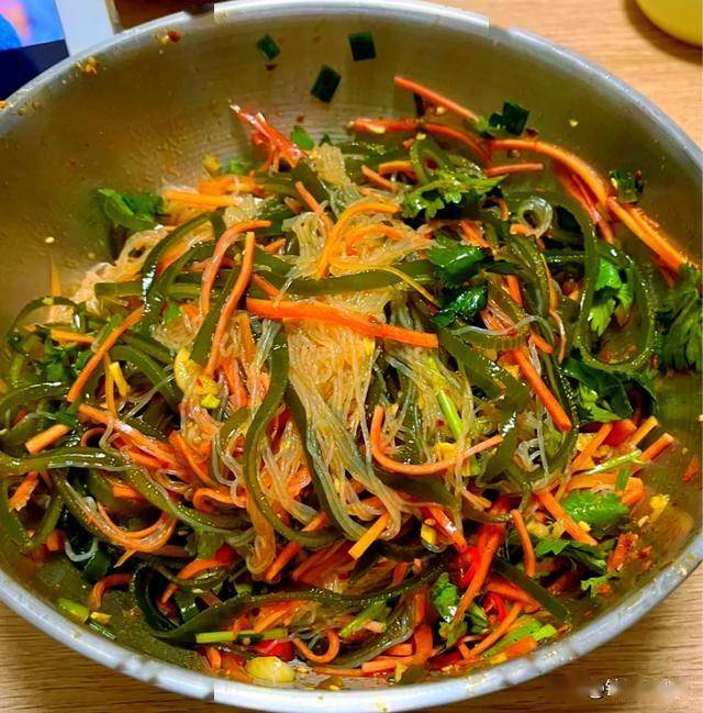 做法:金针菇焯水,黄瓜和胡萝卜切丝,挤干金针菇水分,与其他食材混合,加调料拌匀。