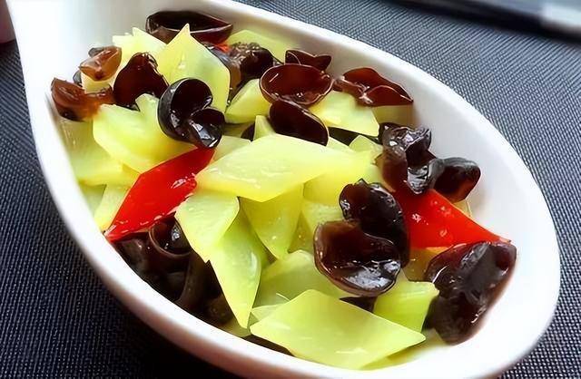 做法:青笋切片,木耳泡发,红椒和蒜切片;爆香蒜片,炒青笋断生,加红椒和木耳翻炒,调味后浇碗汁炒匀。