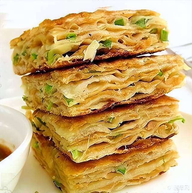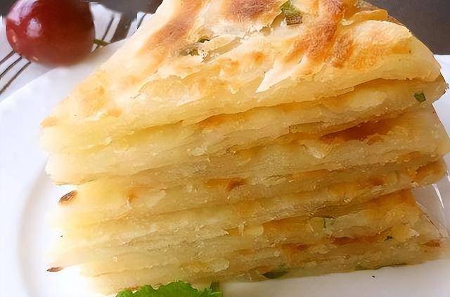 做法:面粉和成面团醒发,擀成面片刷油撒椒盐和葱末,折叠擀薄,烙至两面金黄。