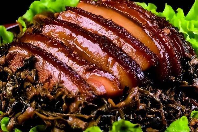 做法:梅干菜泡发洗净,五花肉煮熟抹老抽炸后切片,加调料汁拌匀,肉皮朝下码好,放梅干菜蒸1小时以上,倒扣盘中撒葱花。