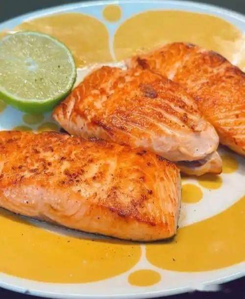 做法:三文鱼腌制后,小火煎至两面金黄,挤柠檬汁。