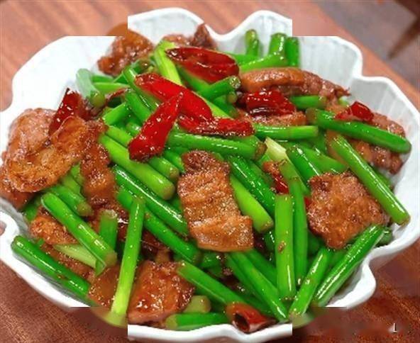 做法:蒜苔处理好切段,焯水1分钟过凉水;五花肉冷冻后切片,煸炒出猪油至金黄;爆香蒜片和红椒块,倒入蒜苔大火翻炒30秒,加调料大火快炒20秒。