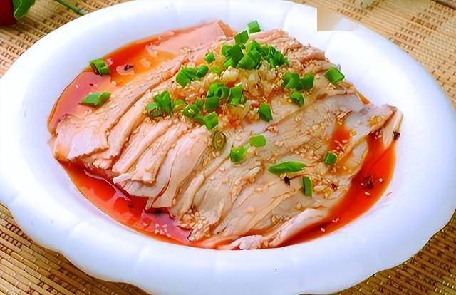 做法:五花肉煮熟放凉切片,调料汁淋在肉片上,淋红油撒葱花。