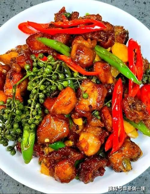 3、锅里留多点油,炒香姜块和蒜头、干辣椒和红和花椒,再放青花椒和辣椒,炒出香味。