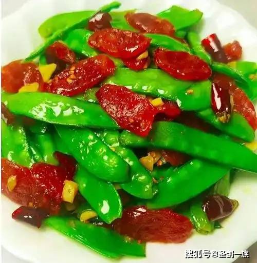 1、准备一把荷兰豆,摘掉两头的老筋,清洗干净。准备两根广式腊肠,斜刀切成薄片。准备几瓣大蒜,切成蒜末备用。