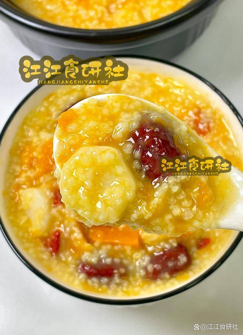 这道粥的颜色金黄金黄的,看着就暖和。南瓜和山药都是健脾养胃的“模范生”,口感绵软,和细腻的小米是绝配。