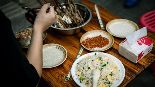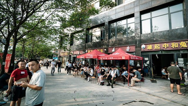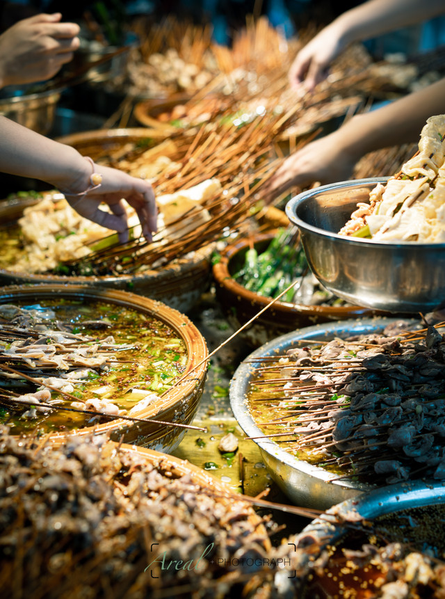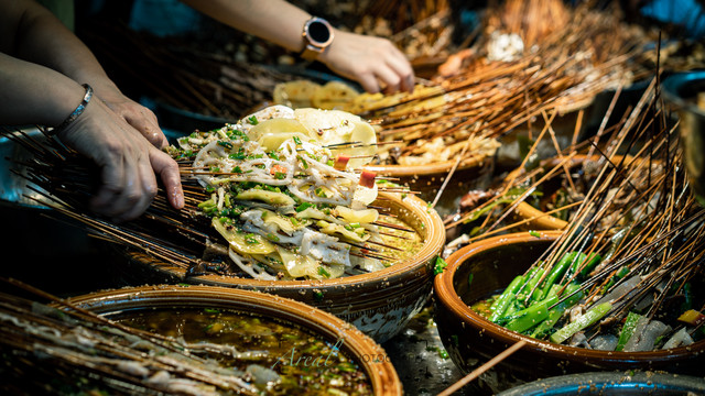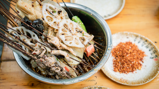 一种半自助路边摊模式,我算是开了眼了。拿着盘子放在桌上,这位置算是有人认领了。然后自己拿串串,自己淋汁。汁分为红油和藤椒两种,随意自取。吃的时候先把串串撸进汤汁中浸泡起来,再沾取干碟,几种辣椒味型叠加后产生让人无法抵抗的诱惑。一口串串一口冰粉,左右开工,吃的不亦乐勿。