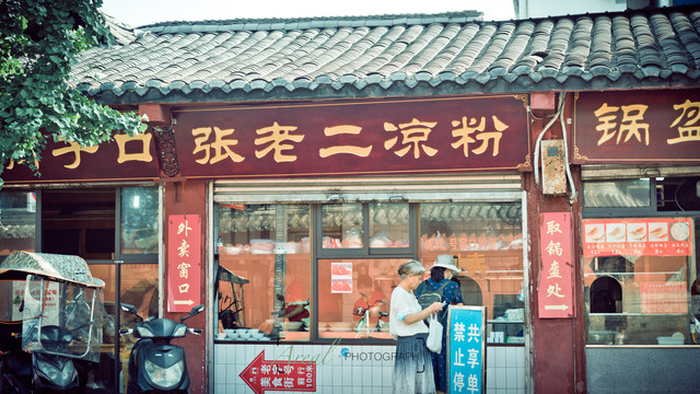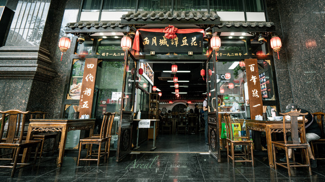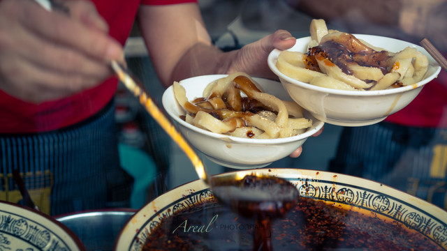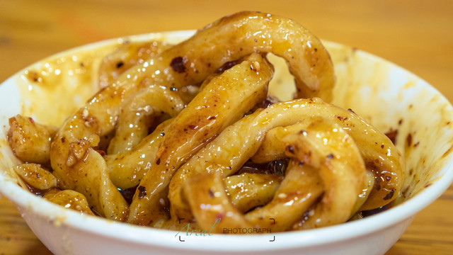 开在文殊院正门斜对面,很好找。绿豆凉粉很滑,带着酸酸的麻辣味,呲溜就滑进嘴里了。甜水面甜、麻、辣,比较像是怪味辣。面条质感粗且硬,一根拎起来有很长,但很好嚼,入口的一瞬间就已经想再来一碗了。