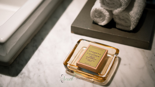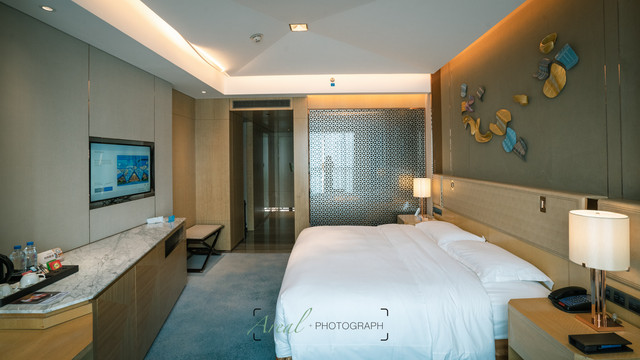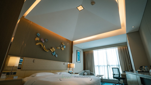 海洋元素从大堂蔓延到房间。房间的天花板是有着切割线条的尖顶设计,灯光昏暗中躺在床上有种睡在帐篷中,还能仰望星光的感觉。