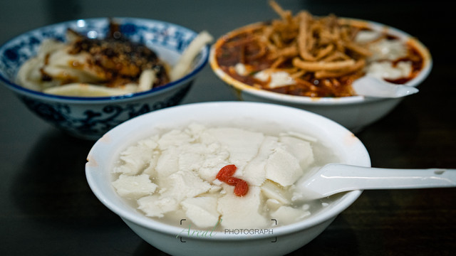 馓子豆花给鲜滑香辣的豆花增添了酥脆的口感;钟水饺是肉香与辣椒香的混合,辣没有吃出几分,都是香;甜水面虽比洞子口张老二略逊一筹,但也是好吃的,最后再来一碗冰冰甜甜的醪糟豆花做ending,人生的幸福感瞬间达到顶峰。