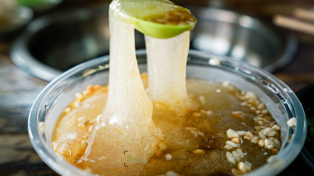 于是我们赶在5点前到,店里已经坐着几桌人,我们找了个冰粉摊旁边的位置坐下。冰粉档是外包的,种类很多,价格便宜,顺手点了糍粑、酒酿两种,随便就能秒掉 深圳 12元一份的冰粉。