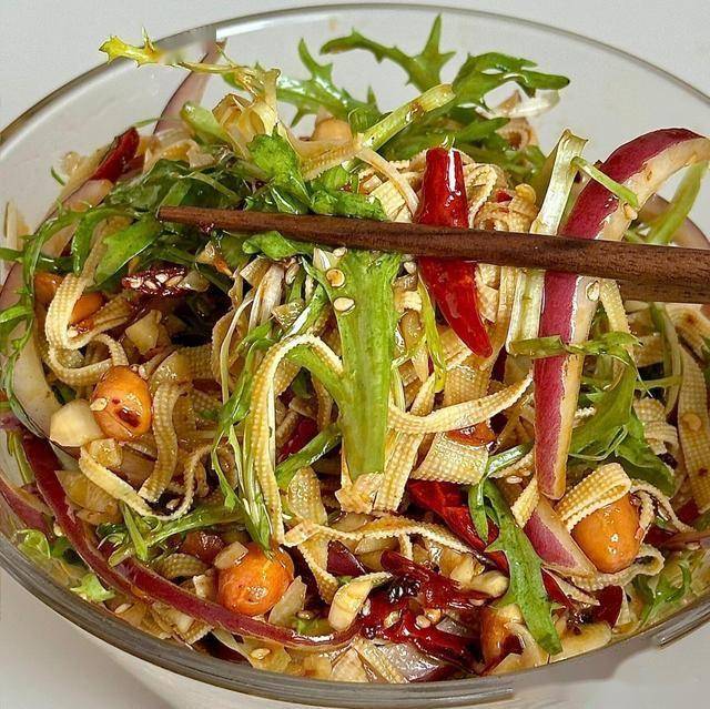 4. 把调好的酱汁浇在苦瓜和熏干丝上,拌匀后就可以装盘了。