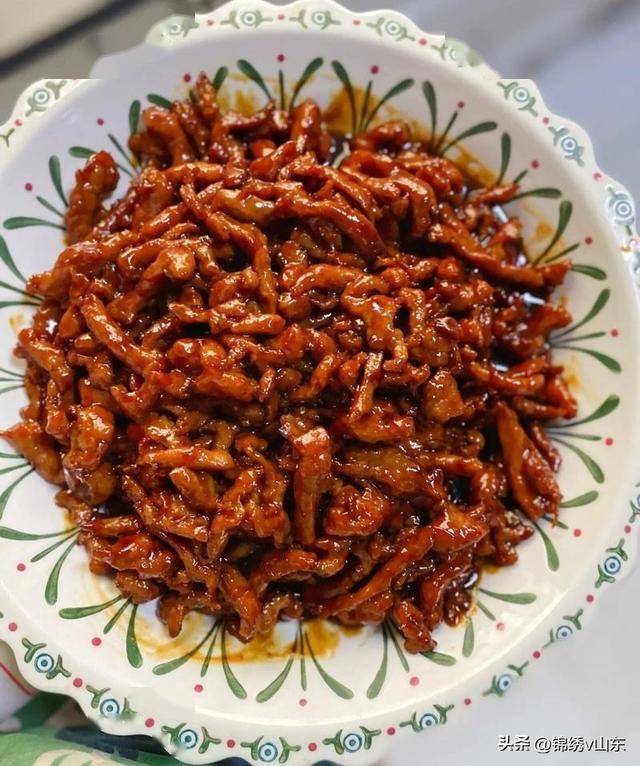 4、另起锅,倒入酱汁,炒至粘稠冒泡倒入肉丝,翻炒裹上酱汁,收汁出锅,装盘的时候摆上大葱丝和胡萝卜丝