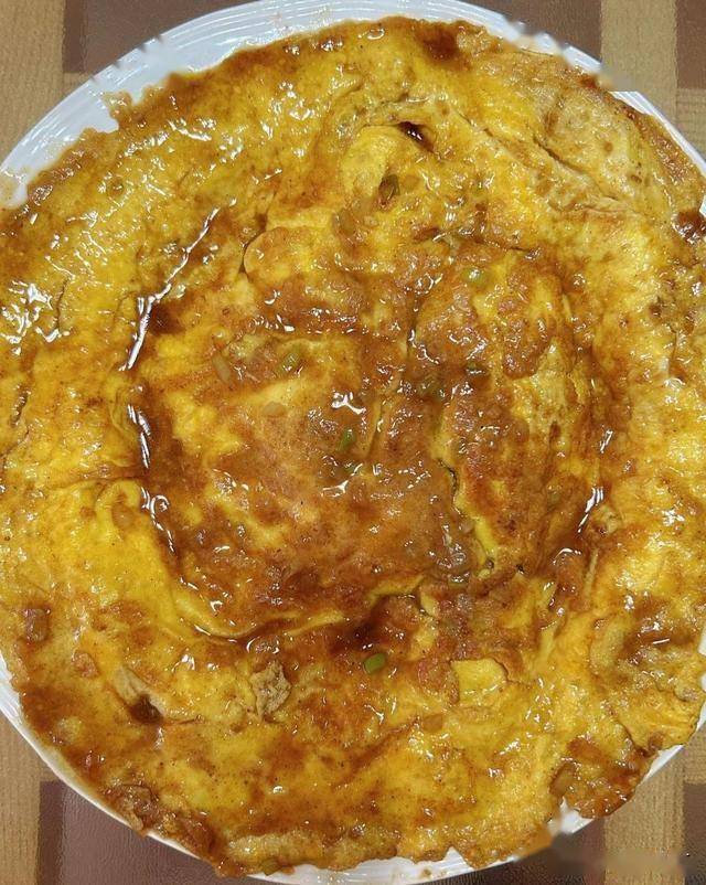 2、起锅热油,肉片炒熟盛出,另起锅,蛋液打散倒入锅中,碗中留少许蛋液,(锅中蛋液多可以用勺舀出来一些),中小火蛋液定型后将肉片铺入锅中,把剩余蛋液倒在肉片上,小火慢煎翻个面用盘子盛出。