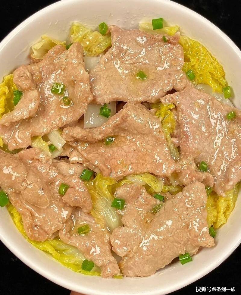 2. 盘底铺上白菜,再铺上腌好的肉片;
