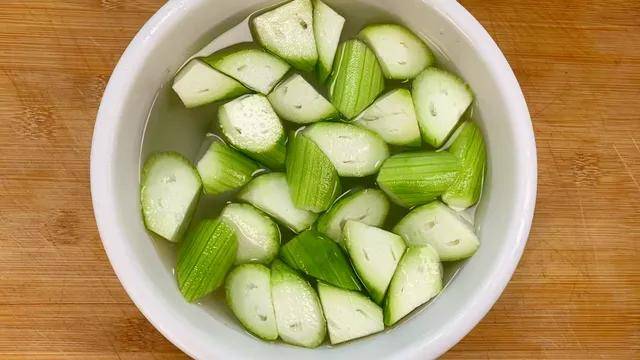 2. 把丝瓜切成滚刀块,切好之后立刻放进淡盐水里浸泡5分钟!这一步太重要了,淡盐水能隔绝空气,防止丝瓜氧化发黑,还能让丝瓜炒出来更脆爽,不会软塌塌的。