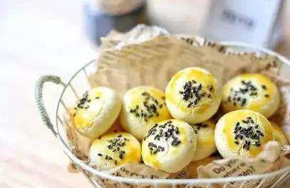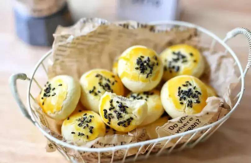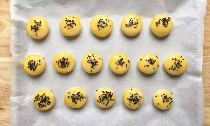 6、将包好馅的剂子,放在烤盘上,烤盘事先垫一张油纸防粘,然后把蛋黄液刷在面团表面,再撒上适量的黑芝麻,最后送入预热好的烤箱中层,上下火168度,烤18分钟即可。