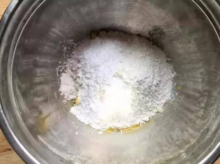 1、将猪油、鸡蛋液、低筋面粉、糖粉倒入盆子里,先用筷子搅拌成絮状,温馨提示,猪油可以用黄油替代,如果用黄油替代的话,必须将黄油软化到和猪油一样的程度,才能使用。