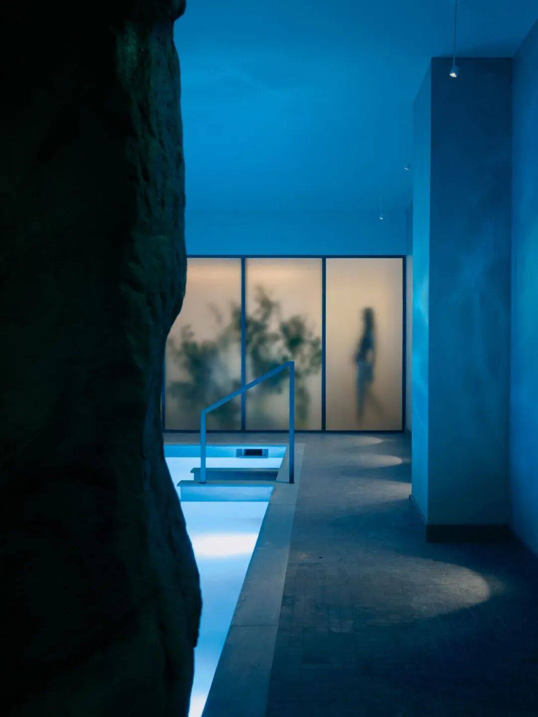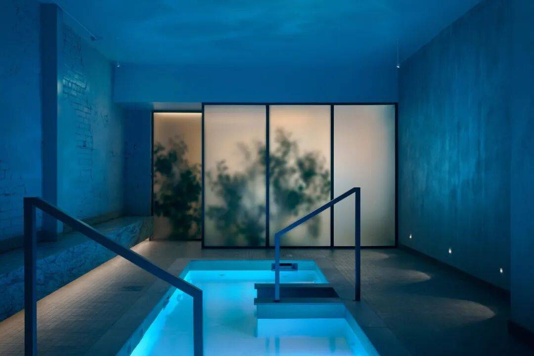 在平面与动线安排上,入口区域首先设置接待与更衣空间,随后引导使用者进入热疗区域。干式桑拿与蒸汽浴室位于核心位置,这些空间在构造上采用较为封闭的围合形式,以满足对温度与湿度稳定性的要求。冷浴池则布置在热疗空间之后,通过体量、材料与环境条件的变化,与前序空间形成区分。各功能区之间通过过渡空间相连,确保使用流程的连续性。