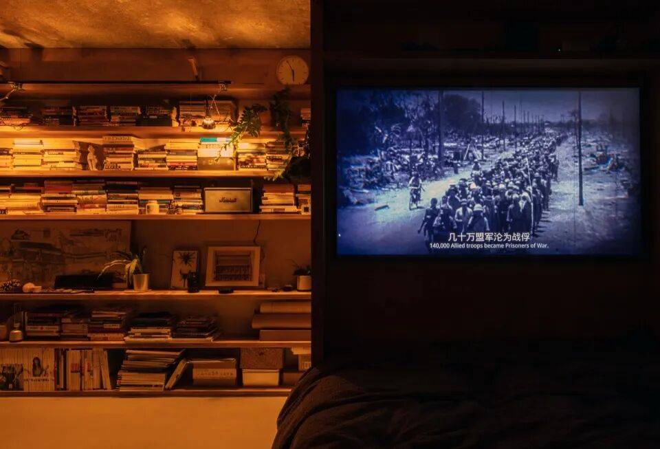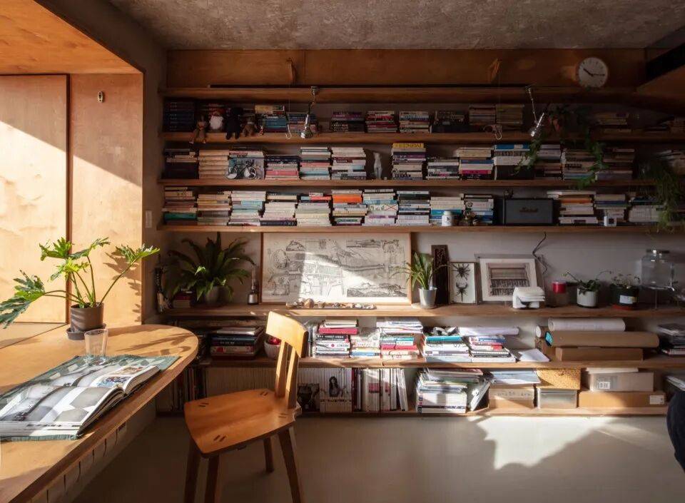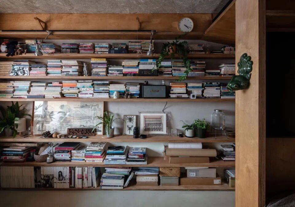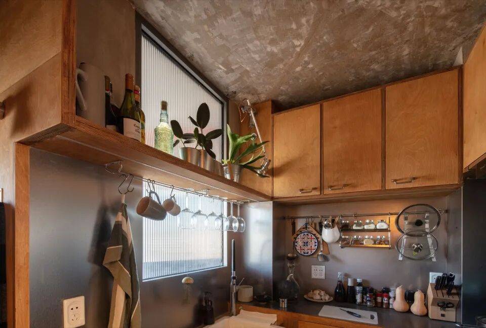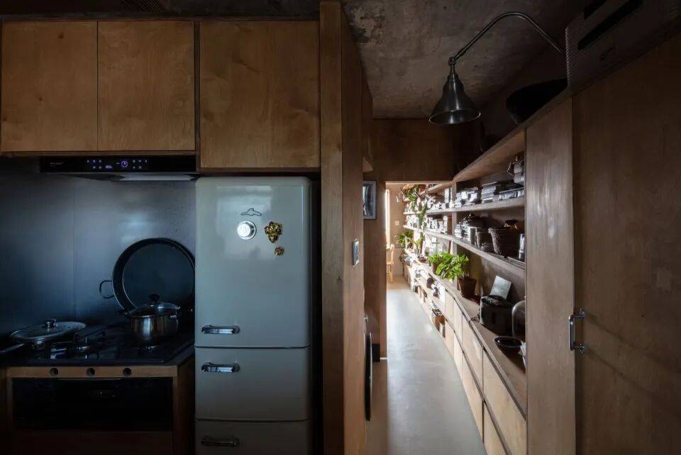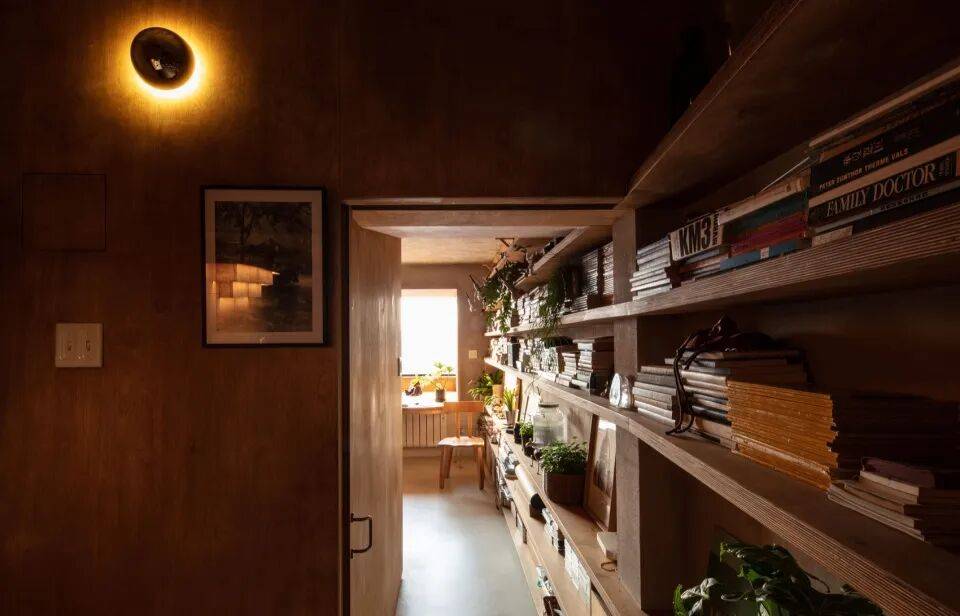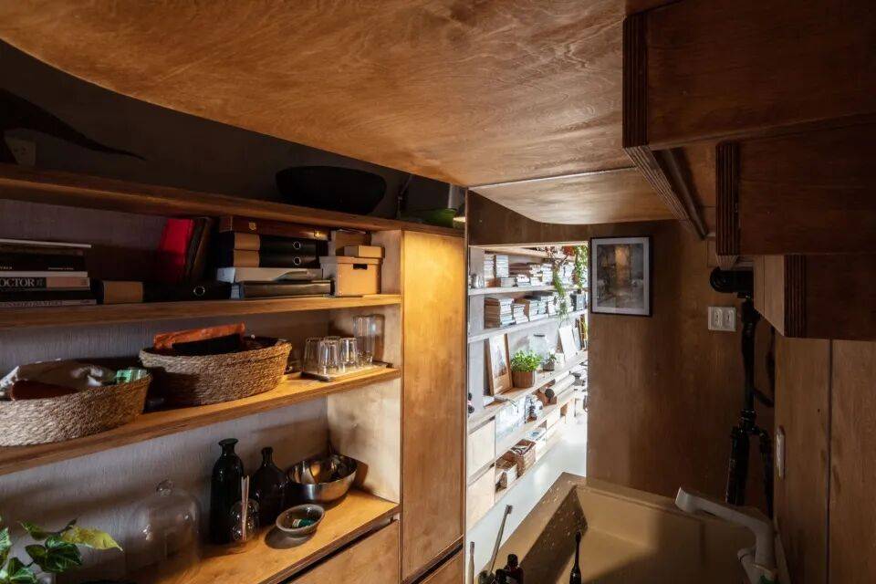 ‌功能嵌入“洞壁”‌:为解决收纳与动线问题,走廊被深度挖掘,两侧设置连续书架,形成“洞壁”。厨房、卫生间、玄关等私密功能则以凹龛形式嵌入墙体,入口仅1.75米高,需低头进入,强化“藏身洞中”的仪式感与私密性。