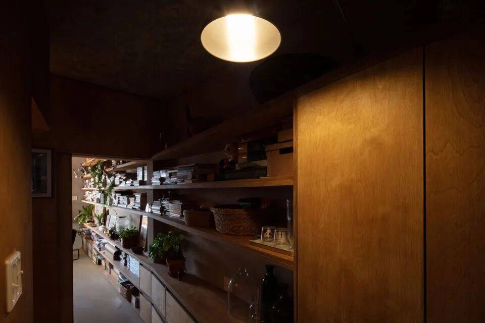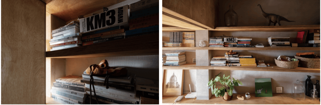 房间狭小又要满足足够的收纳功能。主人夫妇的日常用品,衣物鞋帽,书籍资料等等诸多杂物,都需要被妥善安置。改造选择放弃在大房间中分割储藏区域,而深度挖掘北侧走廊。走廊被挤压成阴翳细长的通道。收纳空间被或左或右安置在两侧。原来正交的走廊,因此发生转折。西侧洞壁被连续的书架和书定义。人们从两个方向进入走廊,视线上,书架都延伸到洞穴深处。这种连续感模糊了空间的边界。唯一的分割门由平开变成推拉,关门的时候,门板顶在书架上,留下一些缝隙。光线可以在缝隙两侧互相渗透。