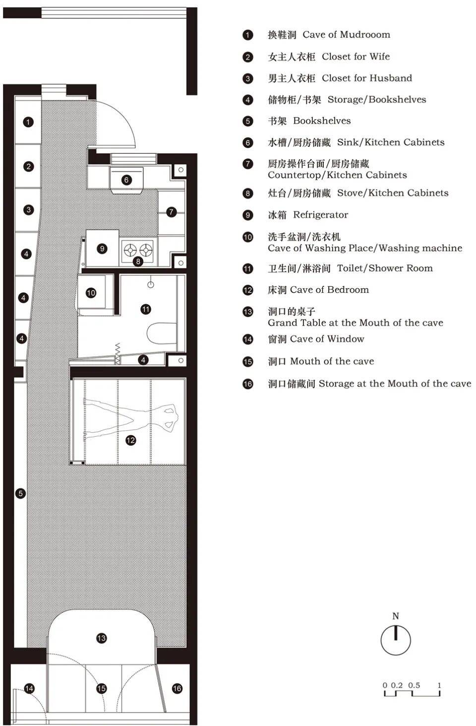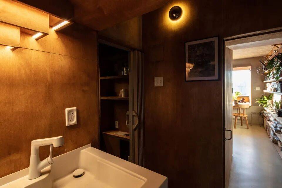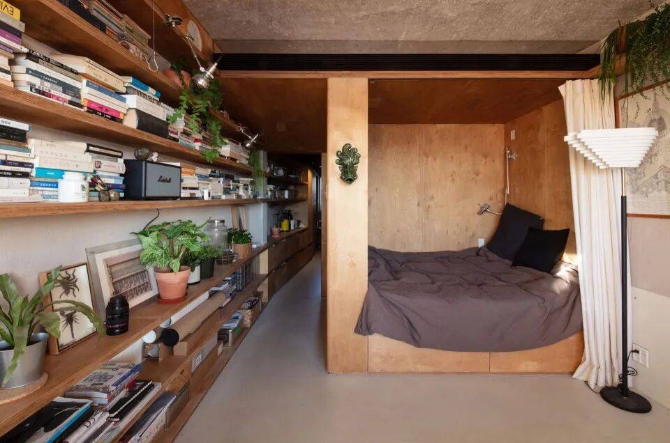 洞中之洞设计:为避免狭窄通道压抑,“洞壁”部分打开,取消隔墙和柜门,将厨房、卫生间、玄关换鞋处变成凹龛,马桶和淋浴封闭,入口故意设置低,增加隐私感。卧室是被板材包裹的盒子,朝向房间一面可拉上帘子,如中国古代架子床或拔步床。