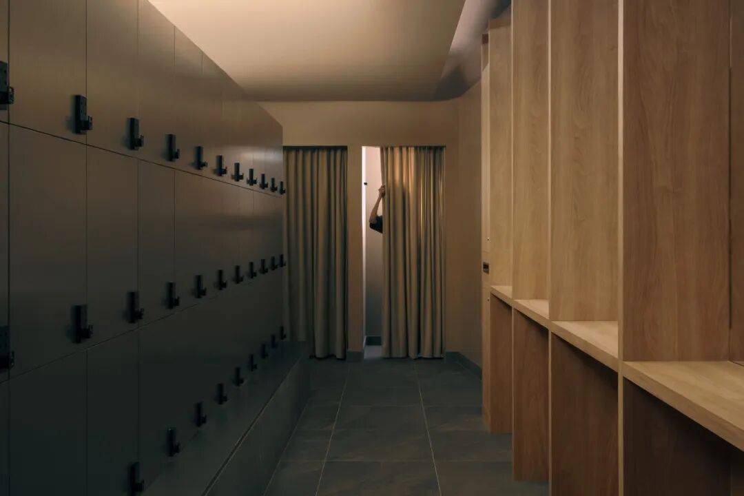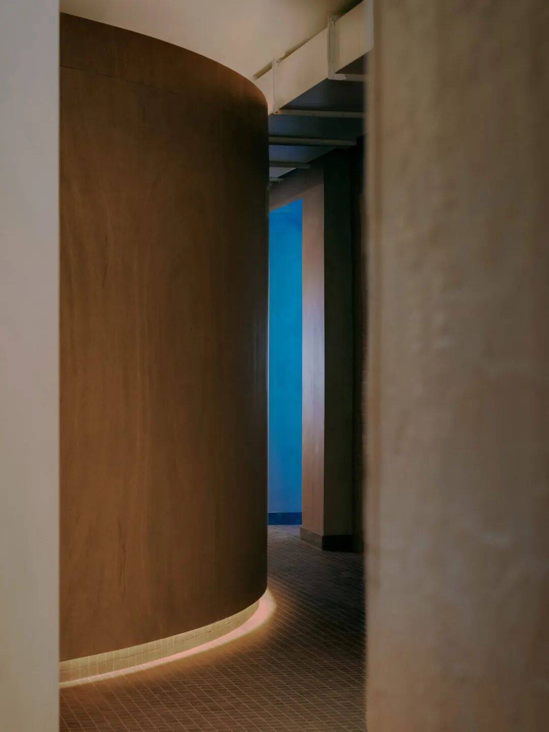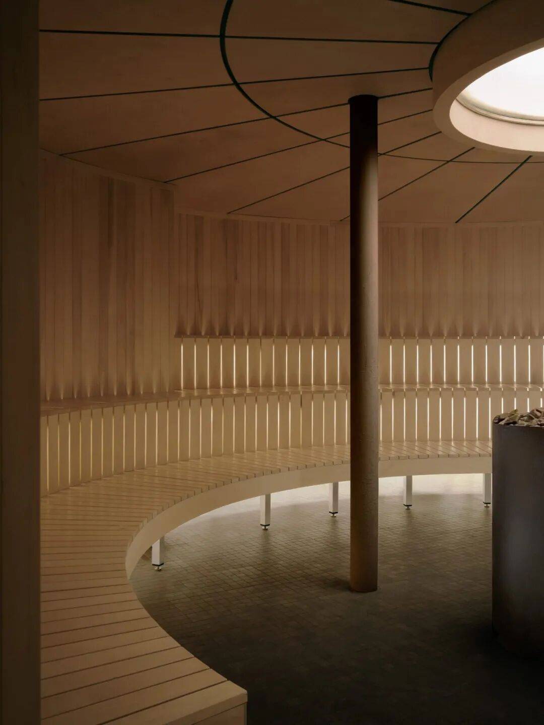 在空间形态上,各功能区在尺度与围合程度上存在差异。热疗空间多为相对紧凑的体量,以控制环境条件;冷浴与休憩区域则在空间尺度上相对放松,天花高度与通道宽度有所增加,用于调节使用者在不同体验阶段的身体与感官状态。这种空间变化与热—冷循环的流程相对应,使不同阶段的使用行为在空间中得到明确区分。