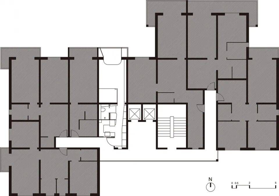北京山顶洞之家位于一座 1985 年建造的 18 层住宅的 17 层,虽为次顶层,但因 18 层需通过角落楼梯回家,此公寓有身处楼顶之感。窗外树木掩映,使馆区建筑难入视野,最近高楼在 1.5 公里外,无遮挡使其四季阳光充足,且能享受使馆区茂密树冠滤过的风。公寓所在楼是城市扩张早期常见的两梯七户高层住宅,为容纳更多居民,户型面积小且一字排开争夺南向采光。山顶洞之家建筑面积仅 41 平方米,是其中最小的户型,处于南北向长条空间中,南端是阳台,北端是入户门和间接采光窗,中间无自然采光机会,形成有明确方向感的空间,向南走向光亮,退后进入阴翳“洞中”。