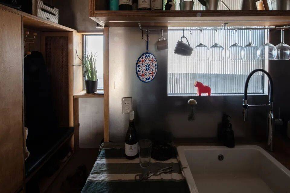 在今天的城市生活中,阳台往往成为鸡肋。反而双层立面,为光线黯淡的室内空间又戴上了一层额外的面纱。人们通常会去掉内侧的门窗。但物业不允许拆除的窗下墙,成为障碍物,并不能把阳台空间有效融入到室内当中。改造依据窗下墙的高度,搭建平台。平台成为一个巨大飘窗,可以让人们或座或卧在洞口,同时也扮演了一张巨大的桌子。这也是这个尺度极小的家里,唯一的桌子。台子下面埋伏了一组收纳空间;上面的窗洞口被一整块玻璃覆盖。两侧旋转门界定这个“桌子”的边界,而窗户开启扇藏在旋转门的背后。没有横竖窗框的干扰,真正实现了“洞口”一样的视野,光照和空间体验。
