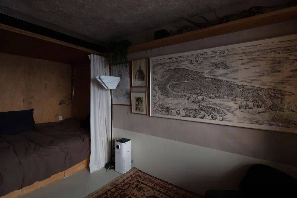 同样的方式被运用在卧室。所谓卧室,是个被板材包裹的盒子。朝向房间一面可以拉上帘子,变成一个更加隔绝隐私的空间,就像中国古代的架子床或者拔步床。山顶洞之家的改造,是在一个极小空间里,一边挖掘场地自身的禀赋,一边探索“家”的意义和可能。“山顶的洞穴”其空间特征被放大,把家具转化成连续的体量或者界面。在橱柜,书架,马桶和床这一系列日常用物之间,通过光线引导,尺度放缩,强化庇护所一般的亲密和安全感。同时观望的洞口被强调,单一方向的光线在洞穴深处幽幽地渗透,附和着那毫无遮挡的视线,这一切似乎把居住者和自然再一次强力的连接在了一起。