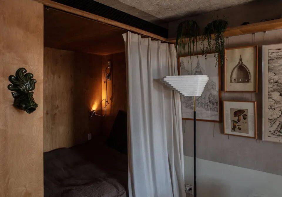 ‌卧室如“架子床”般包裹‌:卧室被板材围合成一个可拉帘的盒子,类似中国古代拔步床,既保障隐私,又延续了“洞中之洞”的空间层次。