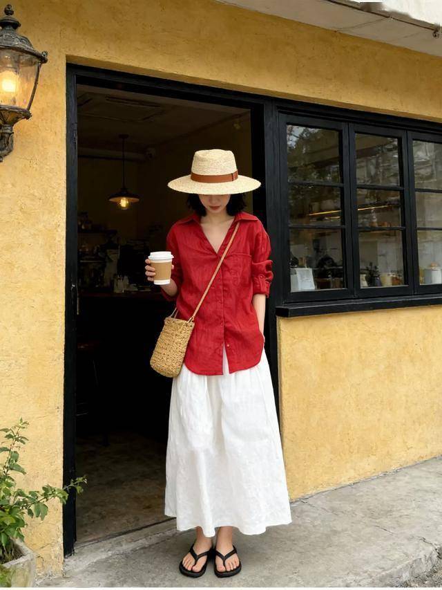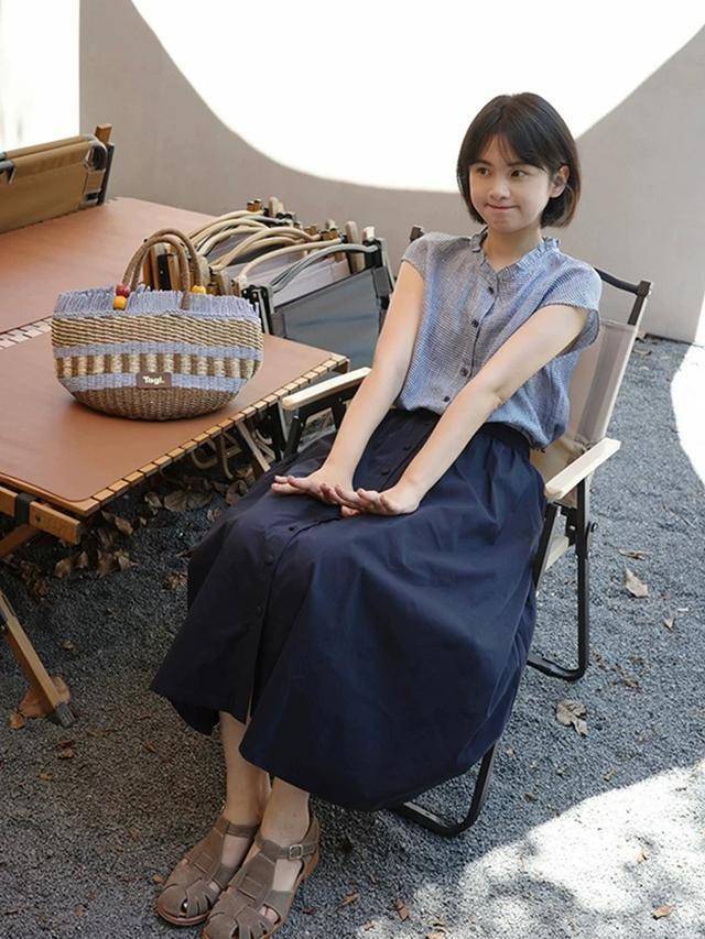 棉麻材质的小衫配半身裙,衣摆塞进裙腰更显高,再配双棕色罗马凉鞋,透气性十足,久穿不累脚。