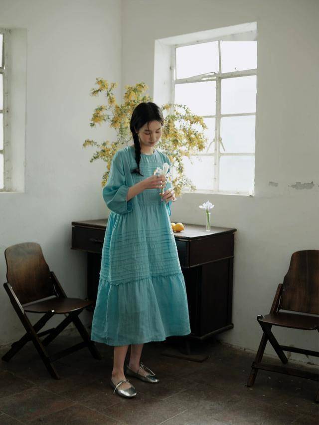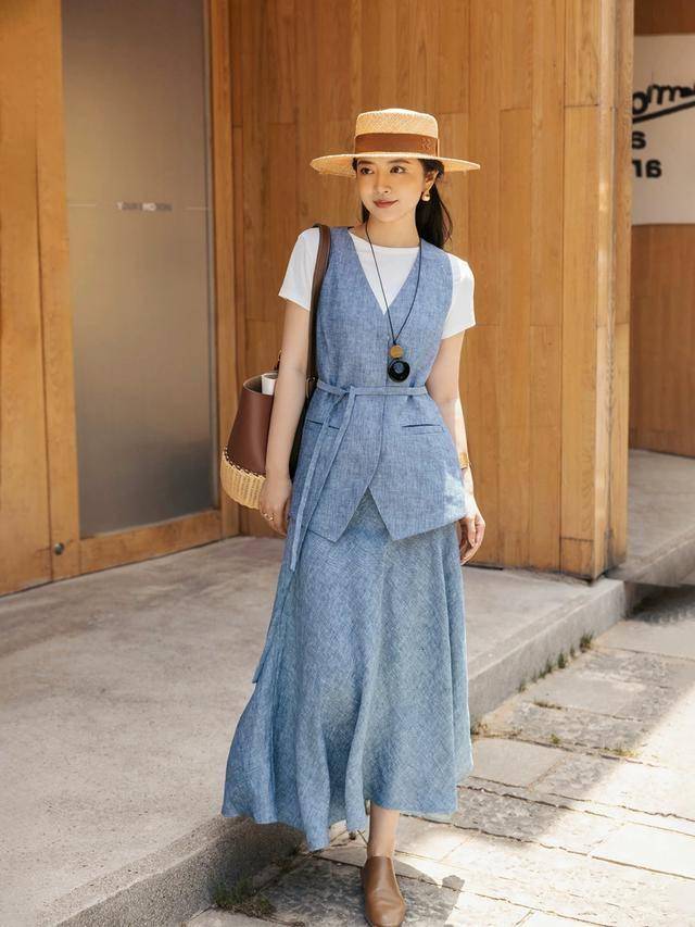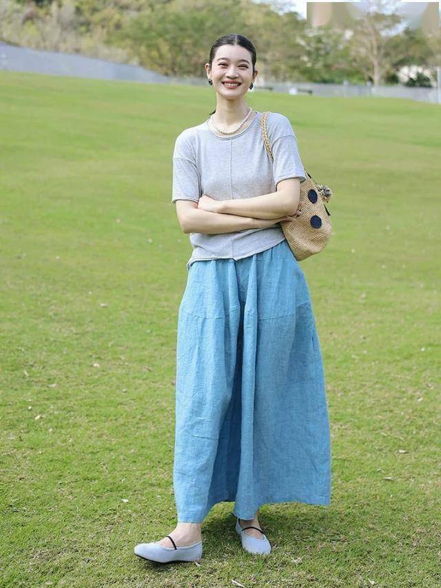 春夏季节,千万不要错过蓝色苎麻裙。