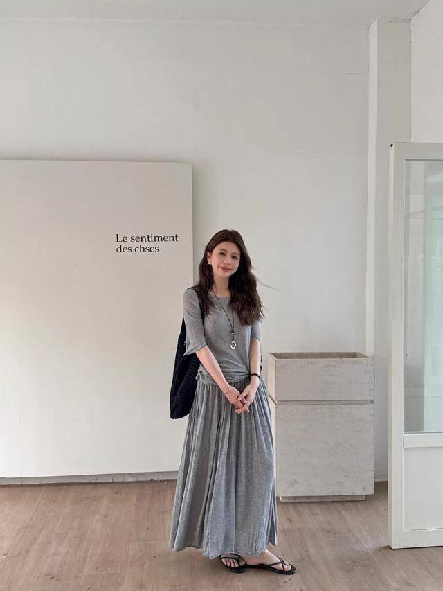 省时又省力的灰色T恤+长裙,穿在身上秒变“韩系女主角”,慵懒氛围爆表,佩戴一条长项链,可以纵向拉长比例。