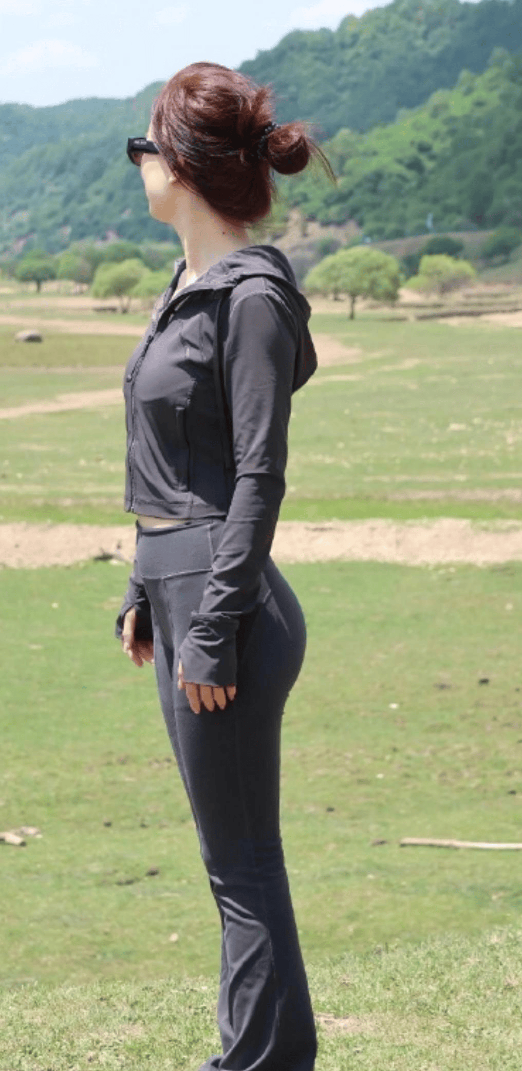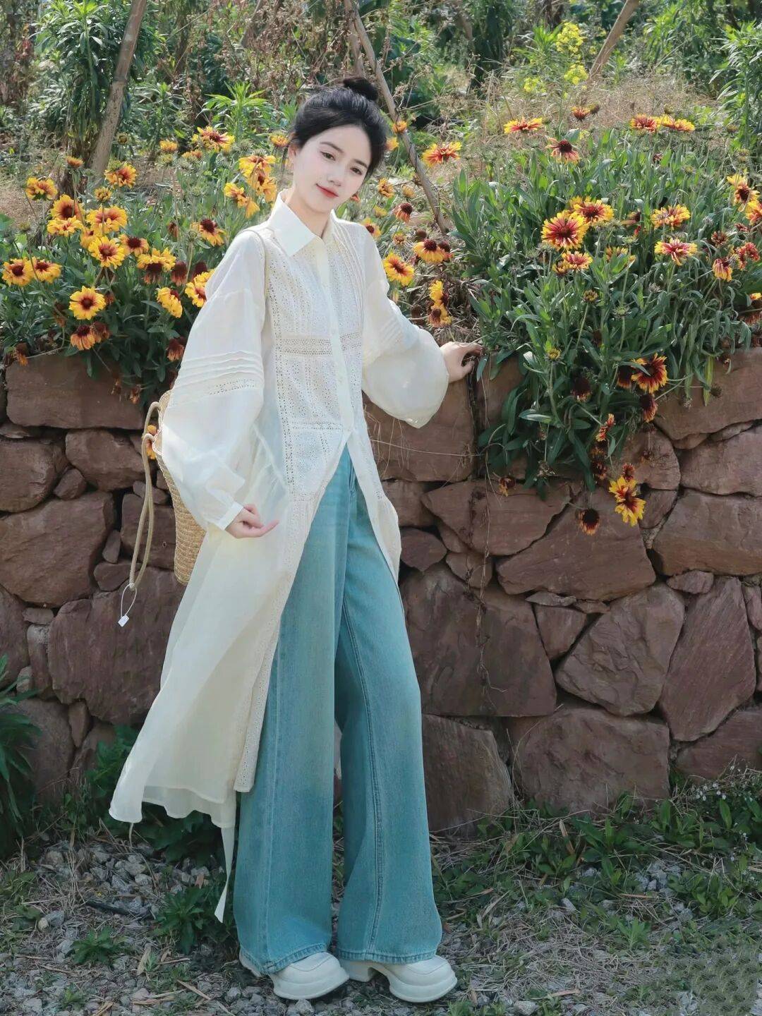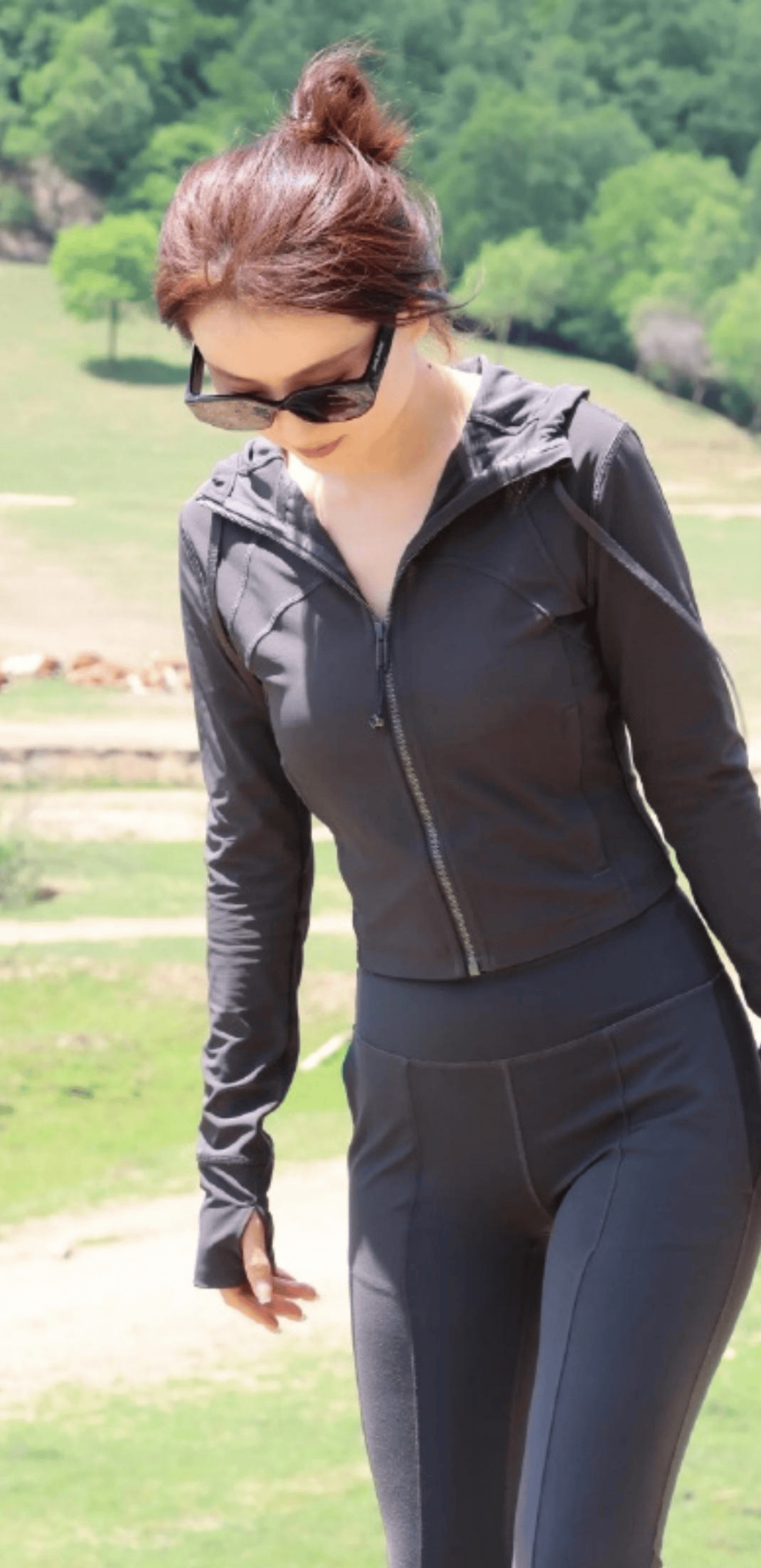 高丸子头是造型的减龄细节,蓬松的发髻清爽利落,完美露出肩颈线条,让身形更显单薄纤细,同时拉长了颈部比例,让整体造型更显挺拔。发丝的碎发增添了随性自然的氛围,与户外的松弛感完美契合,让整个人看起来轻盈灵动,进一步强化了身姿纤细的视觉效果。