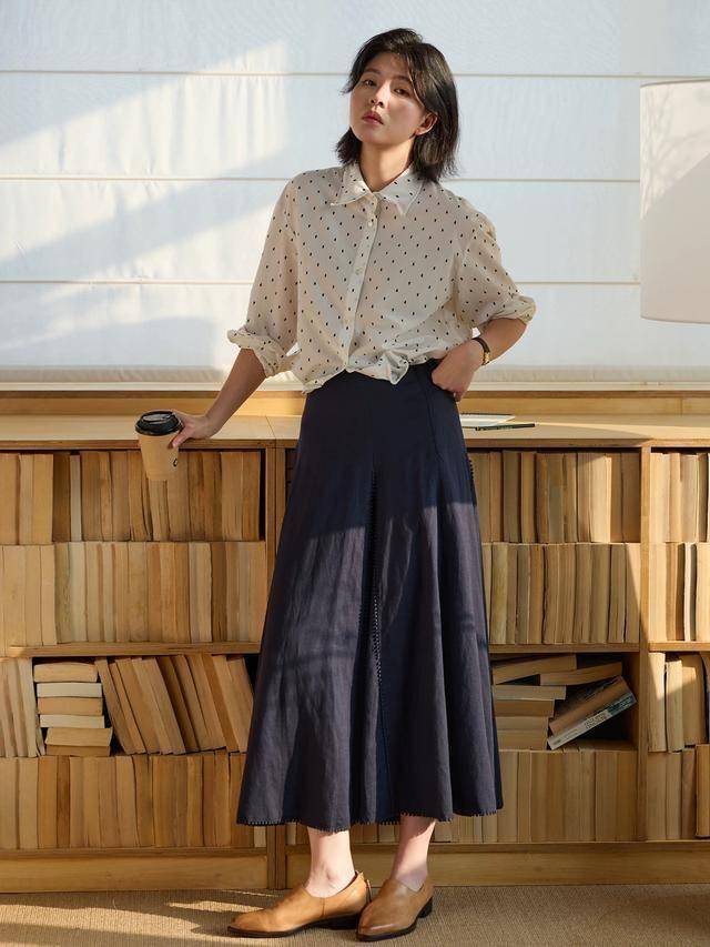 自带柔雾感+垂坠感的长裙,即便是用黑色覆盖,也藏不住它的美,穿在身上颇有一丝文艺范儿,配条波点衬衫,两侧塞进裙腰穿,比例更优越。