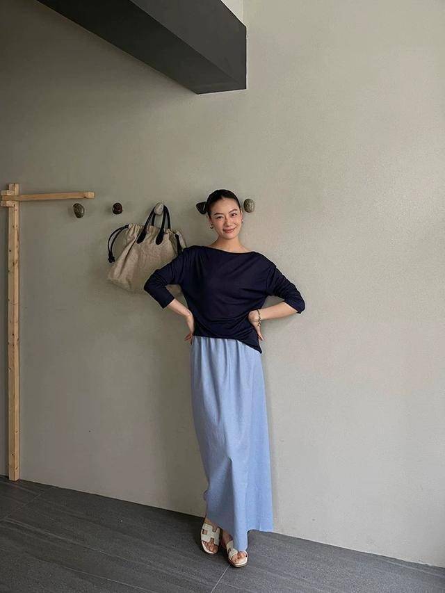 及踝长度的雾霾蓝筒裙,面料光滑细腻,久坐也不易褶皱,配一件黑色罩衫,好有氛围感,袖子卷起来穿增加露肤度,才不会显得沉闷。