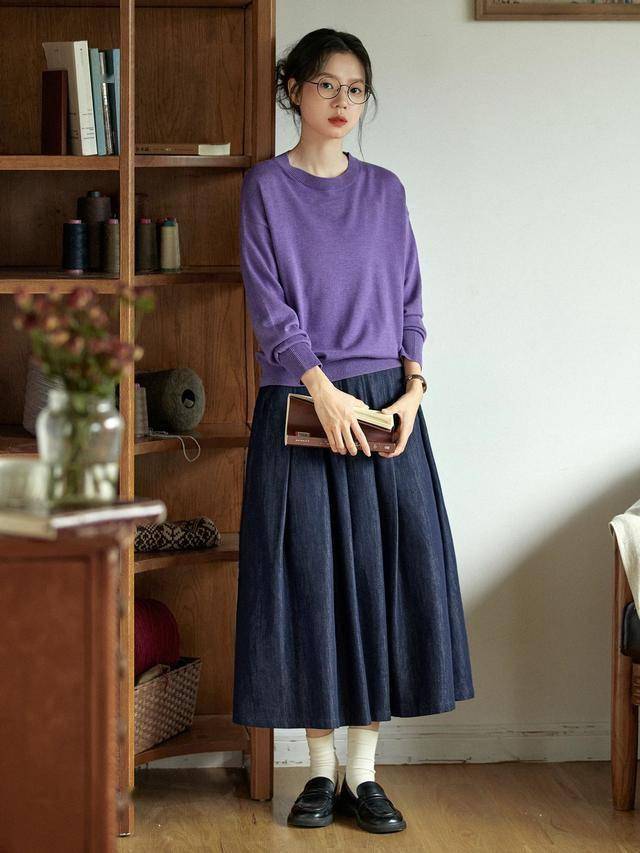 搭配面料软糯的紫色针织衫,刚柔互补,分寸感拿捏的恰到好处,优雅中透露着知识分子的气息。
