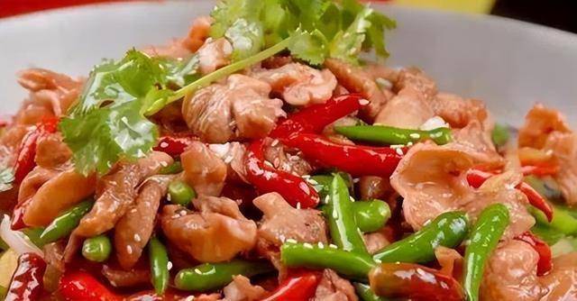 3. 炒锅注油烧热,下入姜丝爆锅,倒入肥肠煸炒,加入青椒段、酱油、盐、料酒、白糖、醋及鲜汤,烧透;再加味精,胡萝卜、香菜、葱花翻炒几下,用水淀粉勾芡出锅即可。