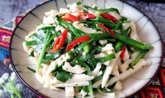 材料:韭菜300g、千张2张、红辣椒一个、盐适量;