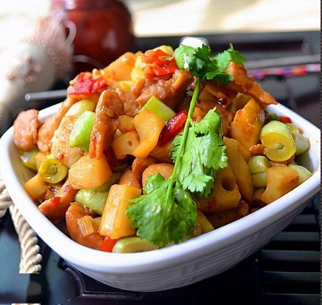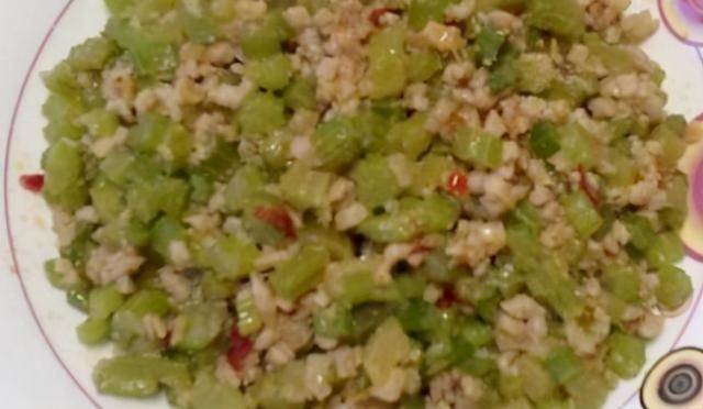 最后加入炒好的猪肉丁,加盐和鸡精调味即可。