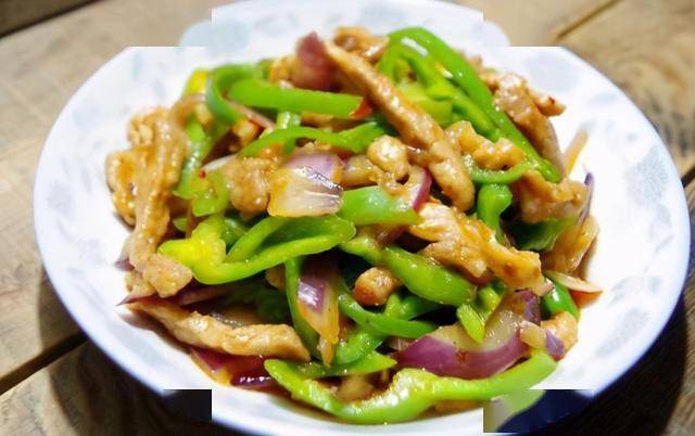 4、放入郫县豆瓣酱,炒至肉丝8成熟,放入洋葱丝、青椒丝。